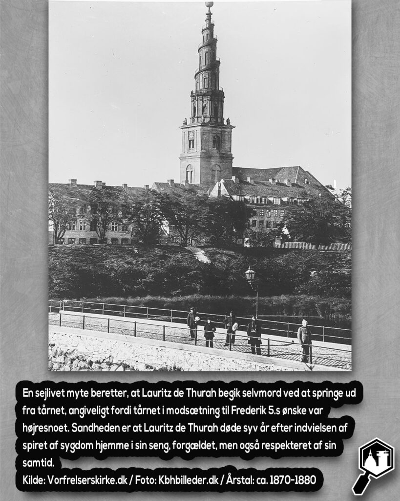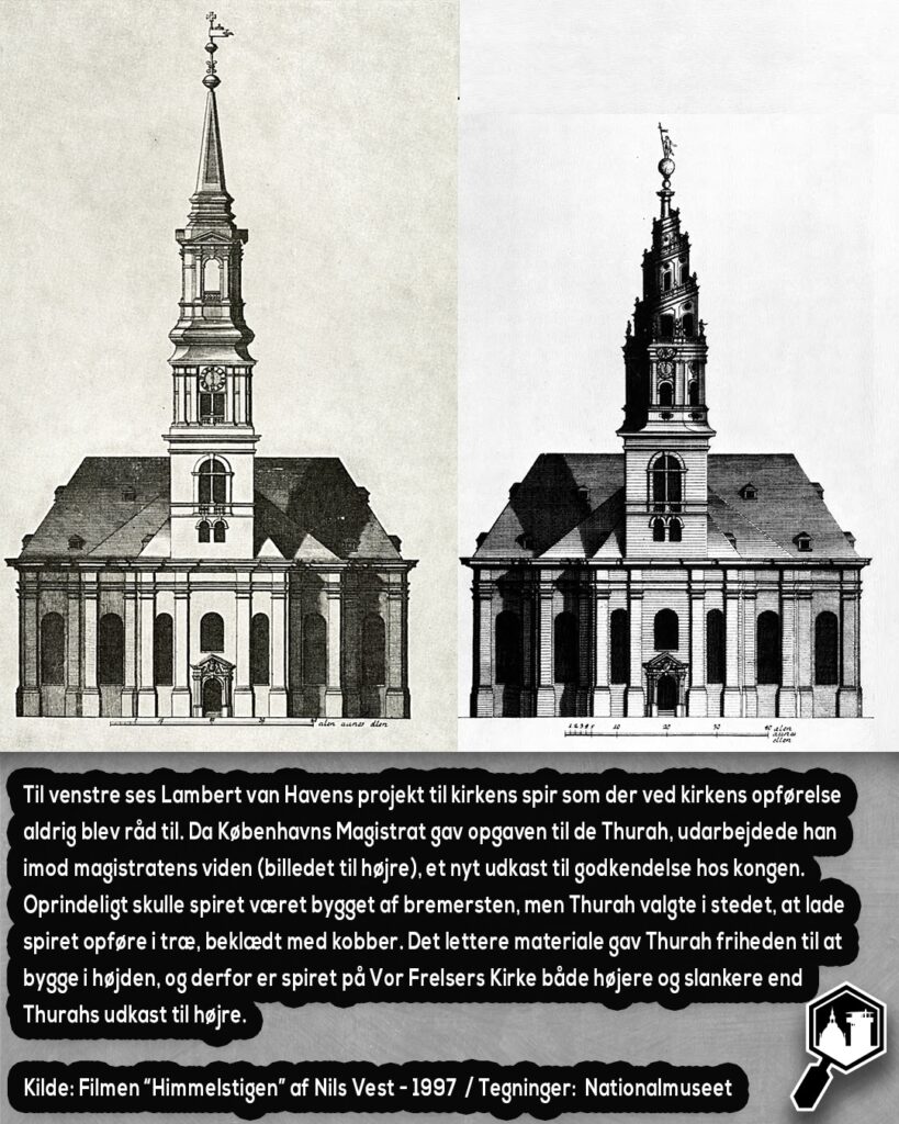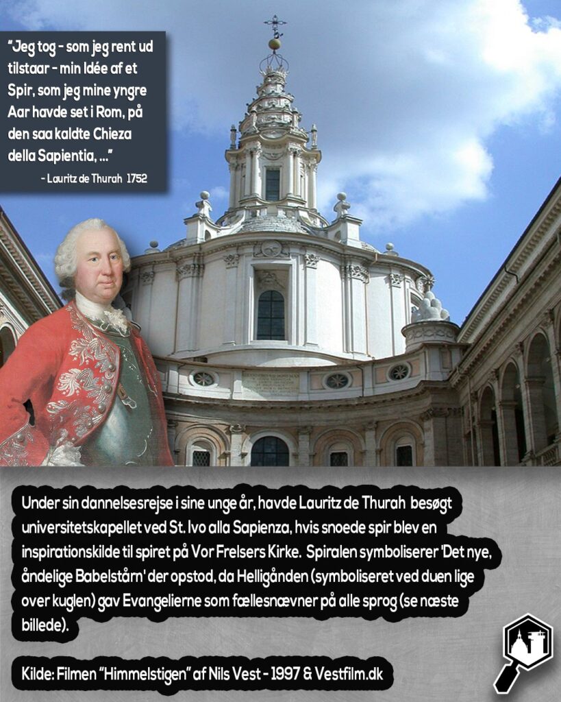 Det snoede spir var ikke van Havens påfund. Det kom nemlig fra Lauritz de Thurah (1704-59) der var Danmarks førende barokarkitekt, og han fik til opgave at bygge spiret på Vor Frelsers Kirke. Magistraten havde rejst tilstrækkeligt med penge, og ønskede van Havens spir opført. Men Thurah havde andre planer. Han gik direkte til kongen og fremførte sin ide om et spiralformet kirkespir, en ide han havde fået fra sin dannelsesrejse i Rom, hvor han havde besøgt universitetskapellet ved St. Ivo alla Sapienza, der har et lignende spir, inspireret af den bibelske fortælling om Babelstårnet (se billede 2 & 3). Thurah fik sit projekt godkendt og betalt hos kongen i 1749 og kunne dermed gennemførte sit mest berømte bygningsværk, som stod færdigt i 1752 til stor glæde for Frederik V.