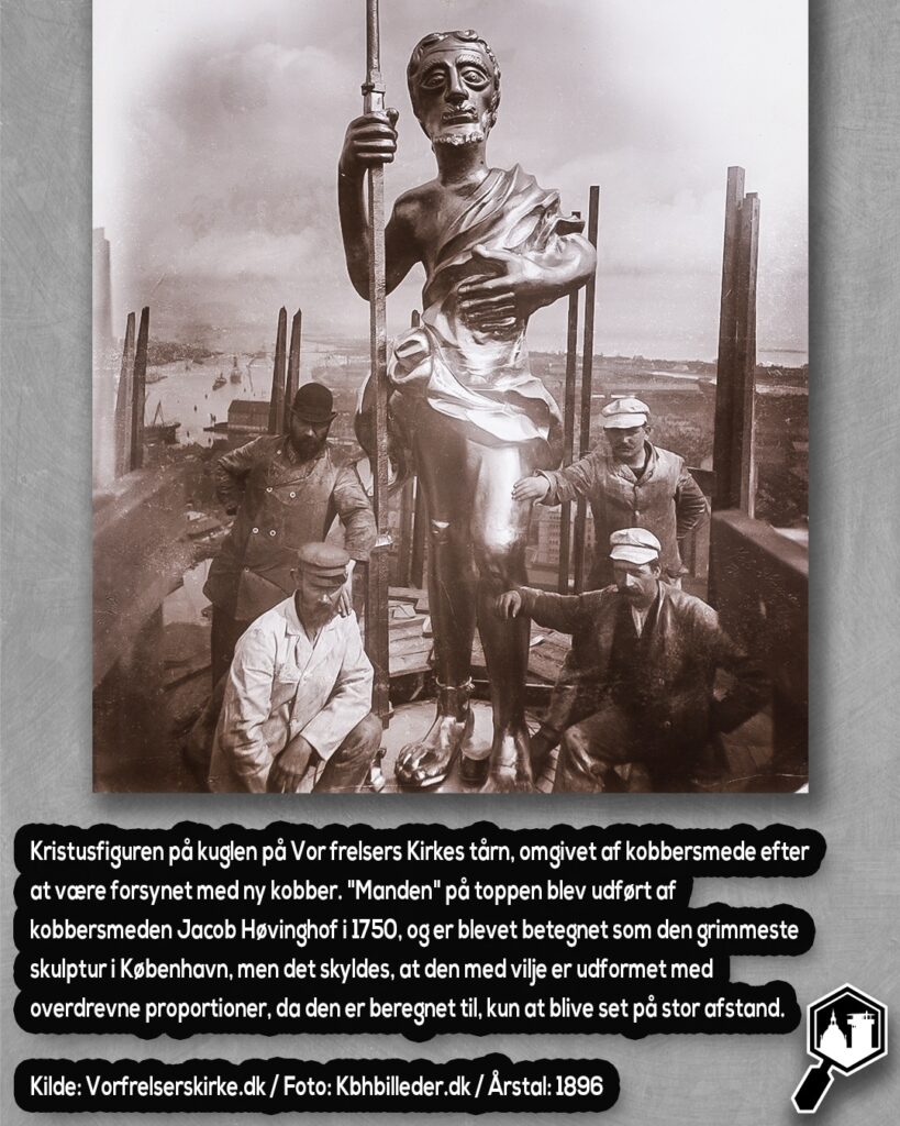 På dette farvelagte motiv fra 1896 ser man tre arbejdsmænd på toppen af det snoede spir af Vor Frelsers Kirke. Centralt i billedet er Kristusfiguren, et omstridt kunstværk, der ofte er blevet kaldt ‘den grimmeste skulptur i København’. Men her, på toppen af kirkens spir, ser vi denne figur i en helt ny kontekst, nemlig for enden af “Himmelstigen”.